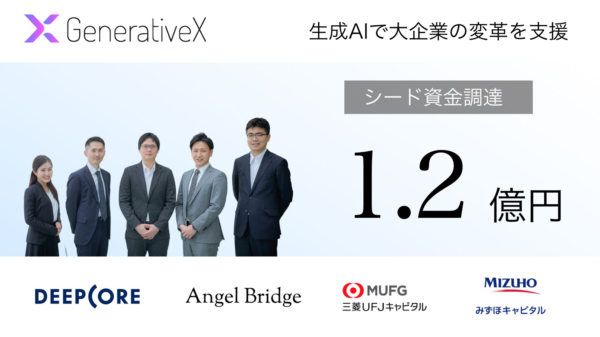 生成AIに関するコンサルティング・アプリケーション開発を行う株式会社GenerativeX(所在地:東京都港区、以下GenerativeX)は、株式会社ディープコアをリード投資家として、シードラウンドにおいて1.2億円の資金調達を完了したことをお知らせします。今回調達する資金をもとに、生成AIを活用した業務の変革を支援する体制を拡充し、クライアント企業における生成AIネイティブな組織構築を推進します。また、今夏には米国オフィスを設立し、海外展開を本格化させる予定です。