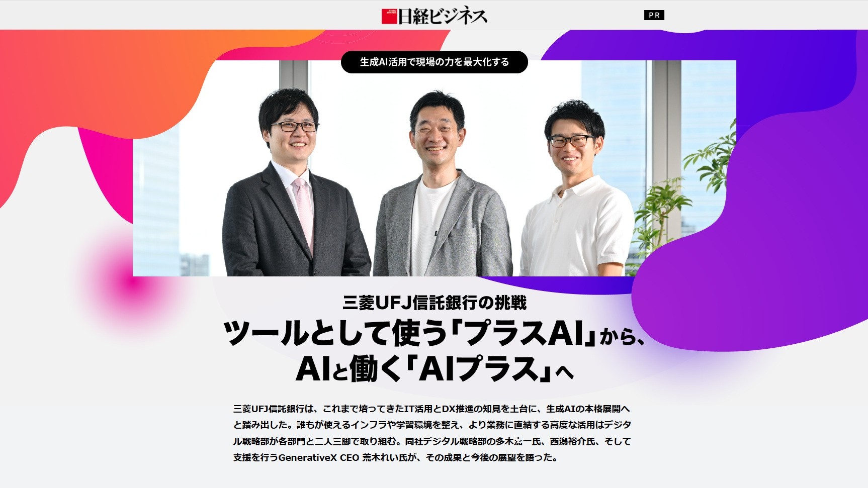 日経ビジネス電子版 Special にて、三菱UFJ信託銀行の生成AI活用の取り組みが紹介されました。本記事では、生成AI活用を支援するパートナーとして登場する GenerativeX 代表取締役 CEO 荒木れいが、プロジェクトの成果と「プラスAI」から「AIプラス」への転換、そして今後の展望について語っています。