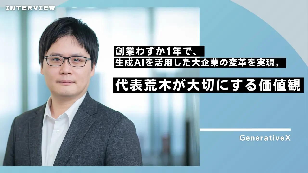 国内の大手企業を中心に、生成AIに関するコンサルティングからシステム開発までを一気通貫で提供するGenerativeX(ジェネレーティブエックス)。2024年4月には、シードラウンドで1.2億円の資金調達を完了。2024年の夏にはアメリカ支社を設立し、海外での事業展開を本格化するとしています。今回は、代表の荒木に、創業の経緯、大事にしている価値観や考え方、求める人物像について話を伺いました。